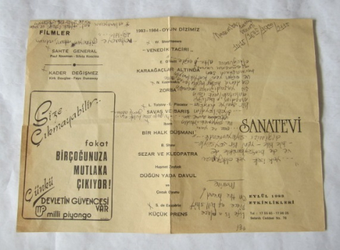 Sanatevi Eylül 1983 Etkinlikleri, 1983 - 1984 Oyun Dizinimiz