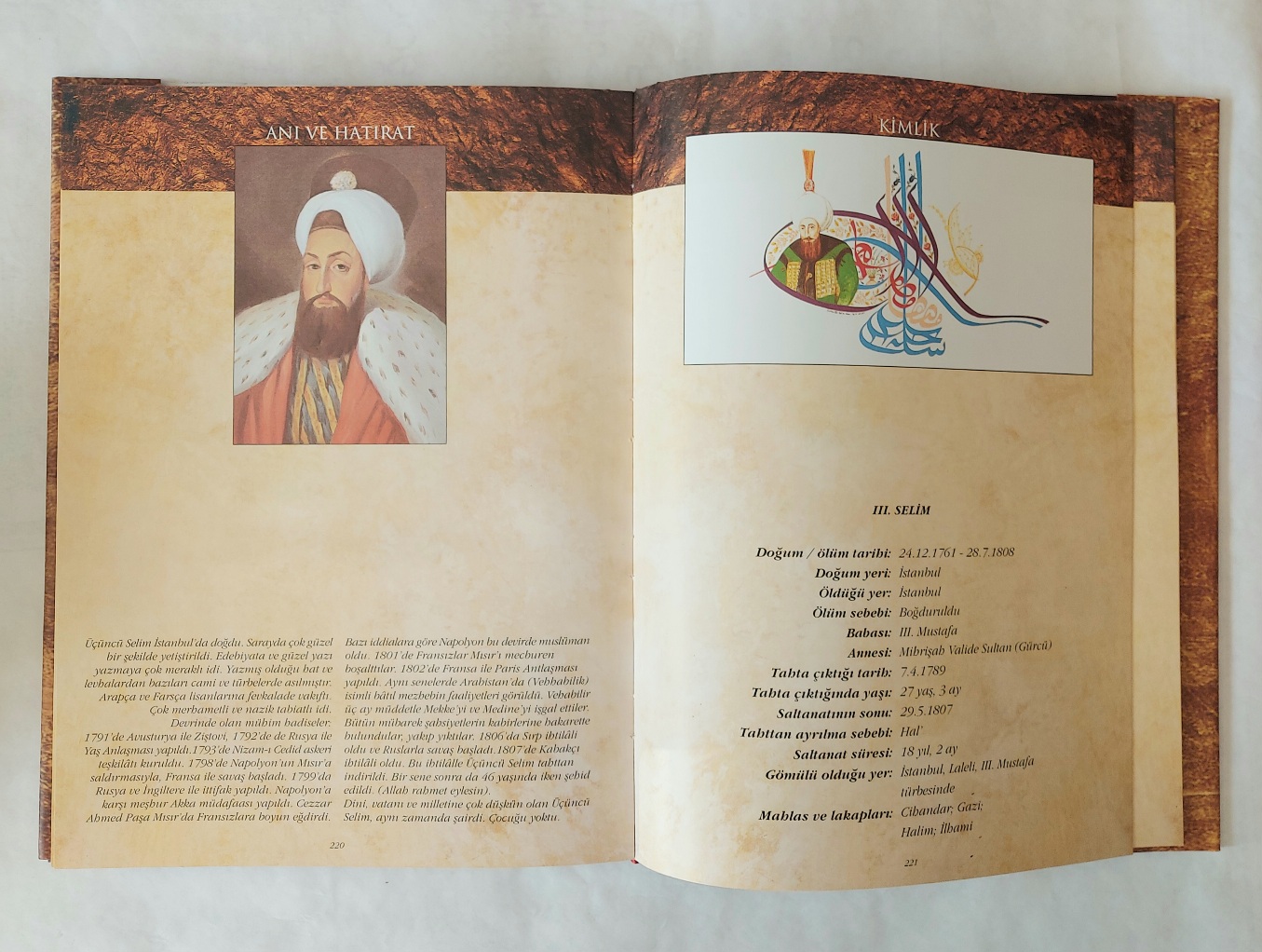 Albümde Cihan'ın en büyük ve uzun ömürlü devletini kurmuş olan Osmanlı padişahlarının dünyasında olacaksınız. Osmanlı padişahları ile tanışacak ve adeta onlarla konuşacaksınız. Her sayfasında bir zamanlar dünyayı titreten yüce devletin sahipleriyle sohbet havası yakalayacaksınız.