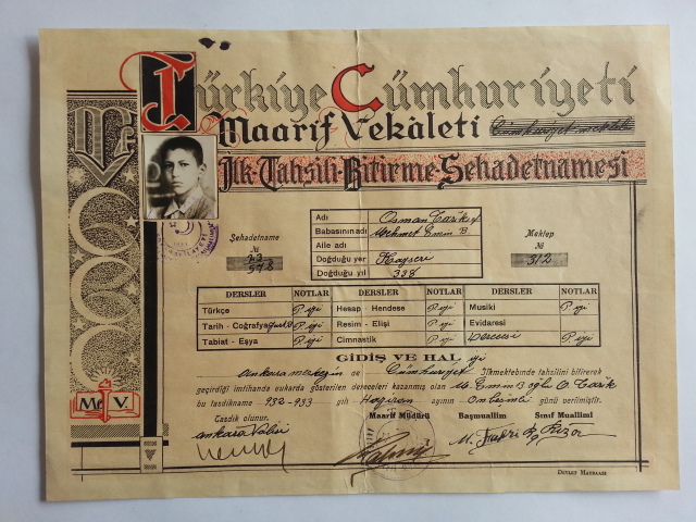Maarif Vekaleti İlk Tahsili Bitirme Şehadetnamesi