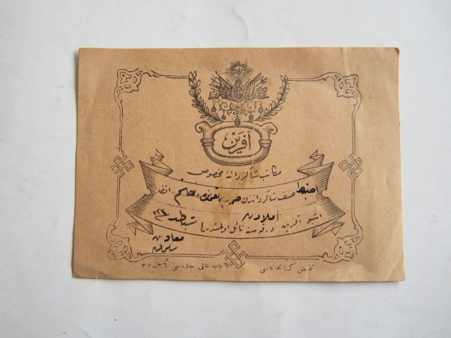 EFEMERA: AFERİN Varakası Mekatib Şakirdanına Mahsus Yakup Haşim Efendiye Verilmiş, 1323 [1907] Tarihli