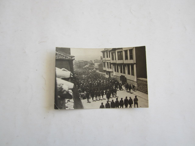 Arkada eski Türkçe Nazım Beyin Cenaze Alayı 1336 yazan, 9x13 ebadında, siyah/beyaz nadir fotokart.