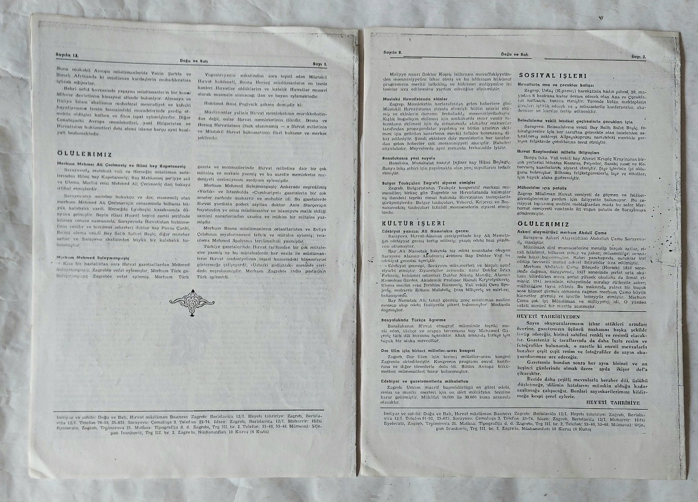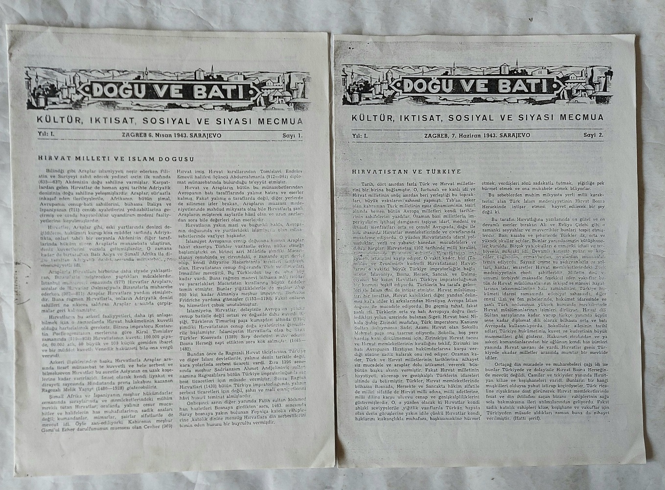 DOĞU VE BATI Kültür, Iktısat, Sosiyal ve Siyasi Mecmua, Zagreb, 6 Nisan 1943 - 7 Haziran 1943, Sarajevo, Yıl: I, Sayı: 1, 2 [2 ADET XEROX]