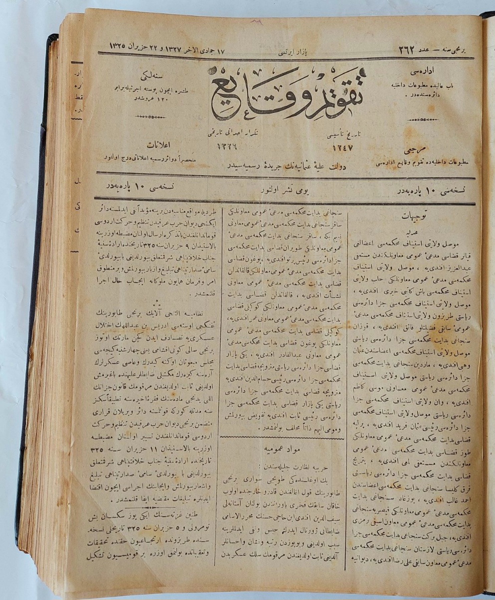 TAKVİM-İ VEKAYİ Devlet-i Aliyye-i Osmaniyyenin ceride-i resmiyyesi, 22 Haziran 1325 - 21 Teşrinievvel 1325 [1909], Sayı 262 - 370 [109 ADET TEK CİLTTE]