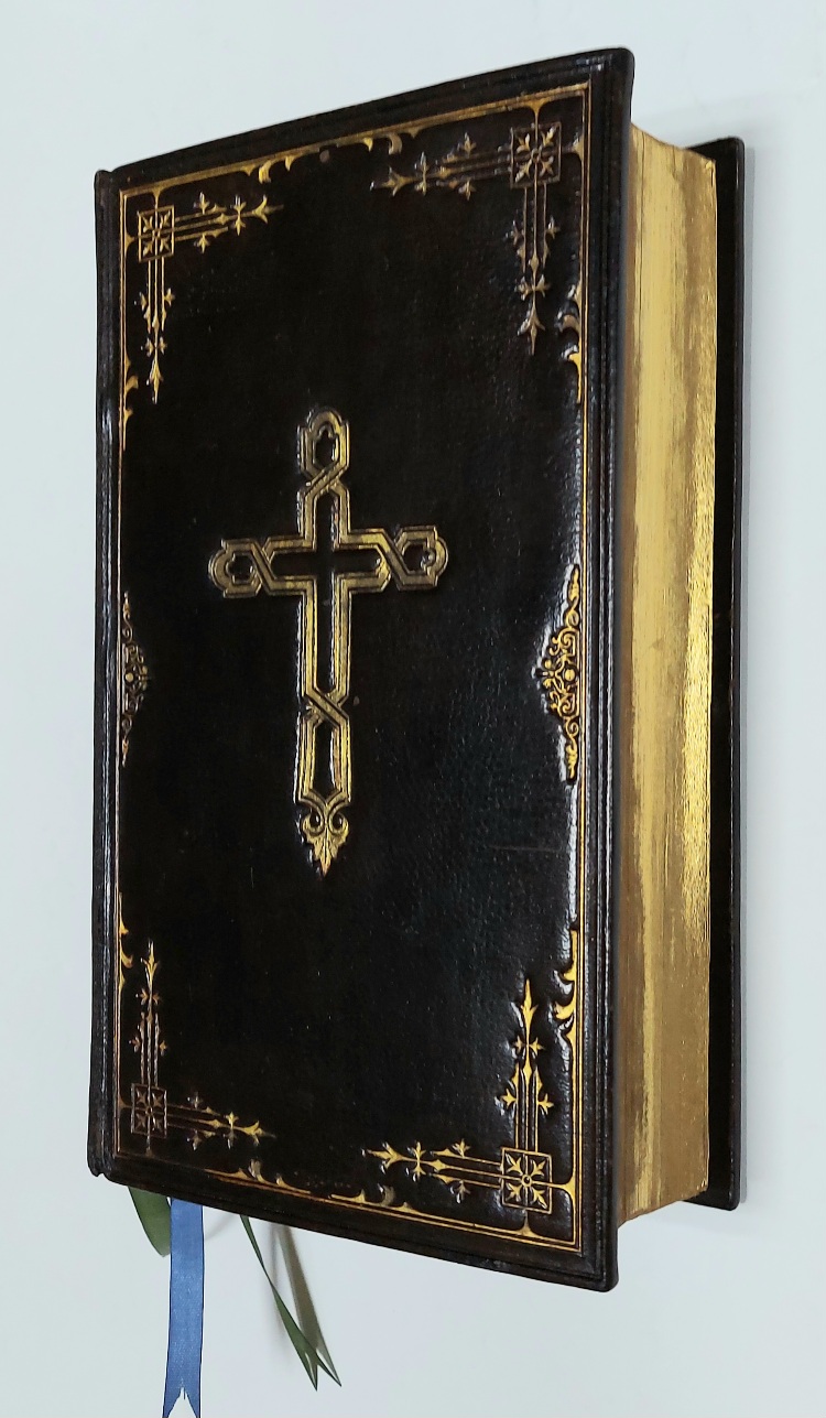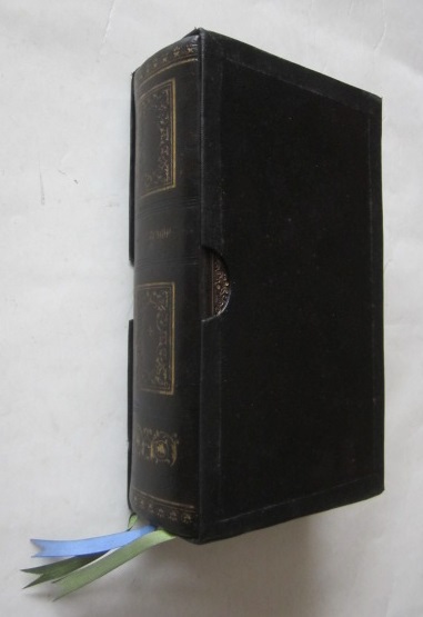 Yanakları altın yaldızlı, komple deri cildinde ve bez mahfazasında.