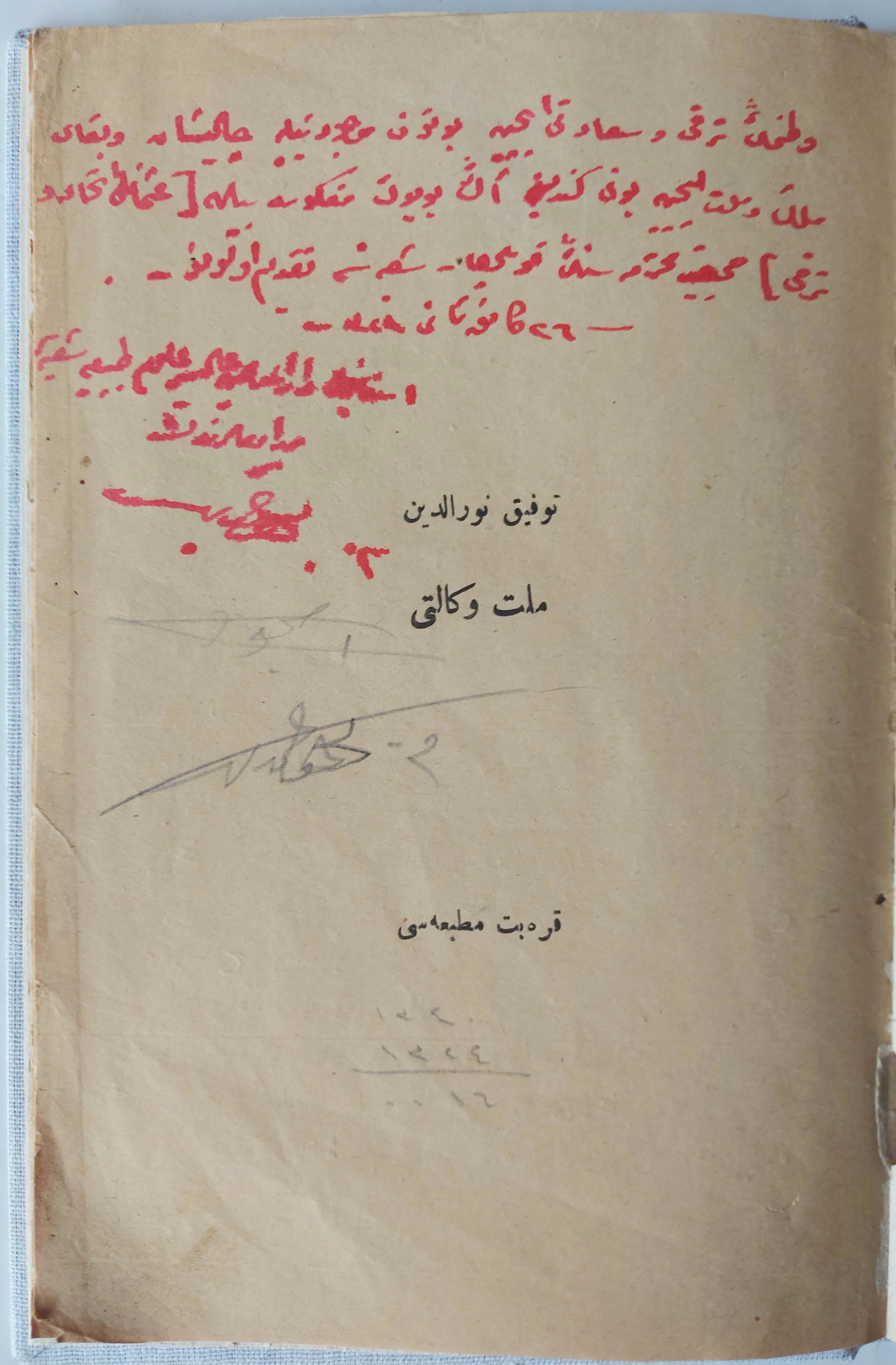 "Vatanın terakki ve saadeti içün bütün mevcudiyetiyle çalışan ve beka-yı millet ve memleket içün bunu kendisine en büyük mefkure ile [Osmanlı İttihad ve Terakki] Cemiyet-i muhteremesinin Koyulhisar şubesine takdim olunmuştur. 26 Kanunisani 324. İstanbul Darülmuallimin-i âlisi ulum-ı tabiye Şubesi muallimlerinden Tevfik Nureddin"
