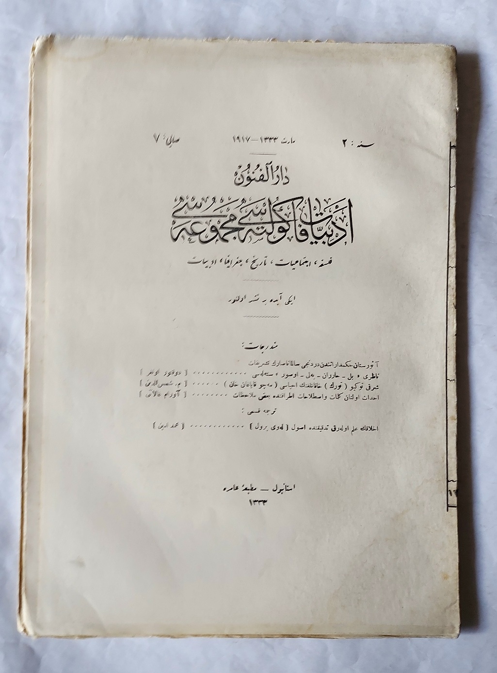 DARÜLFUNUN EDEBİYAT FAKÜLTESİ MECMUASI Felsefe, İctimaiyat, Tarih, Coğrafya, Edebiyat / İki Ayda Bir Neşrolunur, Teşrinisani 1333 / 1917, Sene: 2, Sayı: 7