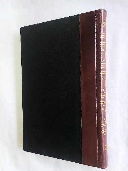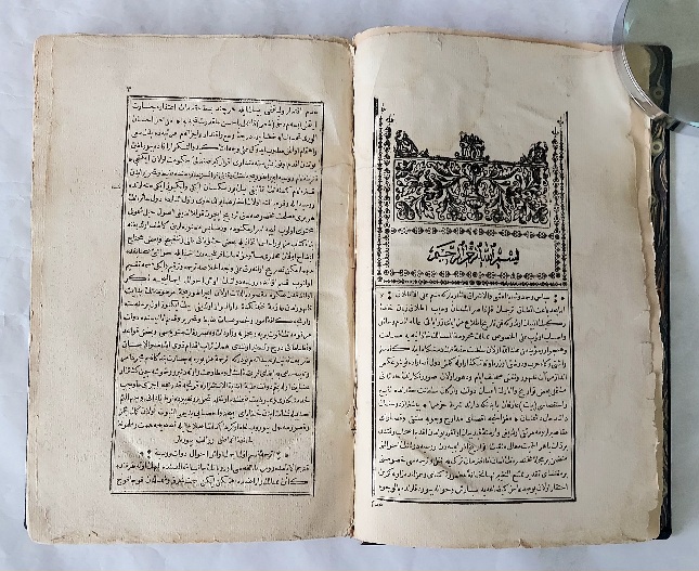 Yan kağıtları ebrulu, sırtı deri sanatkarane cildinde.