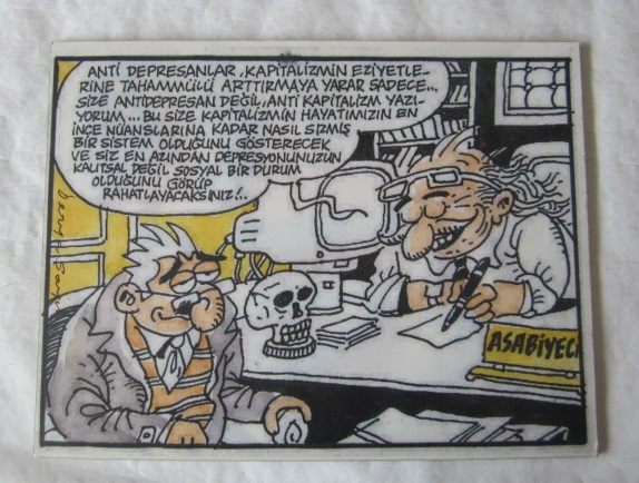 Büyütülmüş duvara asmaya hazır, manidar karikatür.