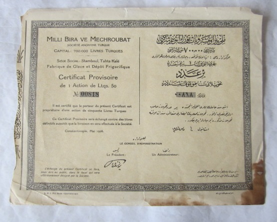 HİSSE SENEDİ: Milli Bira ve Meşrubat Türk Anonim Şirketi 1926, Numero 00818
