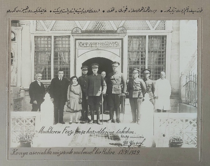 "Muhterem Fevzi Paşa hazretlerine takdim. Müze Müdürü M. Yusuf. Konya asariatika müzesinde mubeccel bir hatira 12/9/1929"