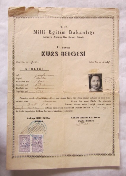 T. C. Milli Eğitim Bakanlığı Ankara Akşam Kız Sanat Okulu C. Şubesi Kurs Belgesi - Şerife Kutluy'a Ait