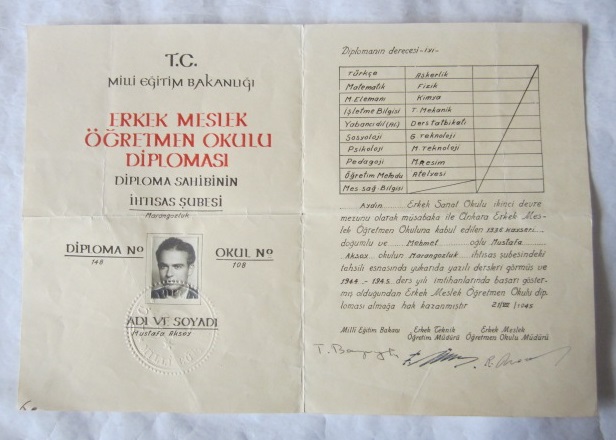DİPLOMA: T.C. Milli Eğitim Bakanlığı Erkek Meslek Öğretmen Okulu Diploması Mustafa Aksoy'a Ait 21.8.1945
